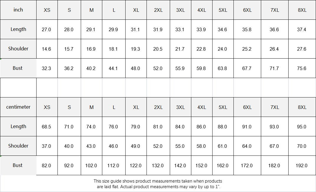 | centimeter | XS | S | M | L | XL | 2XL | 3XL | 4XL | 5XL | 6XL | 7XL | 8XL |
