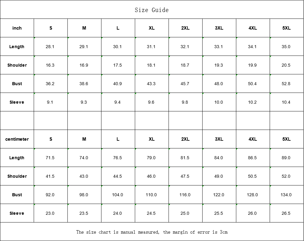 | inch | S | M | L | XL | 2XL | 3XL | 4XL | 5XL |
