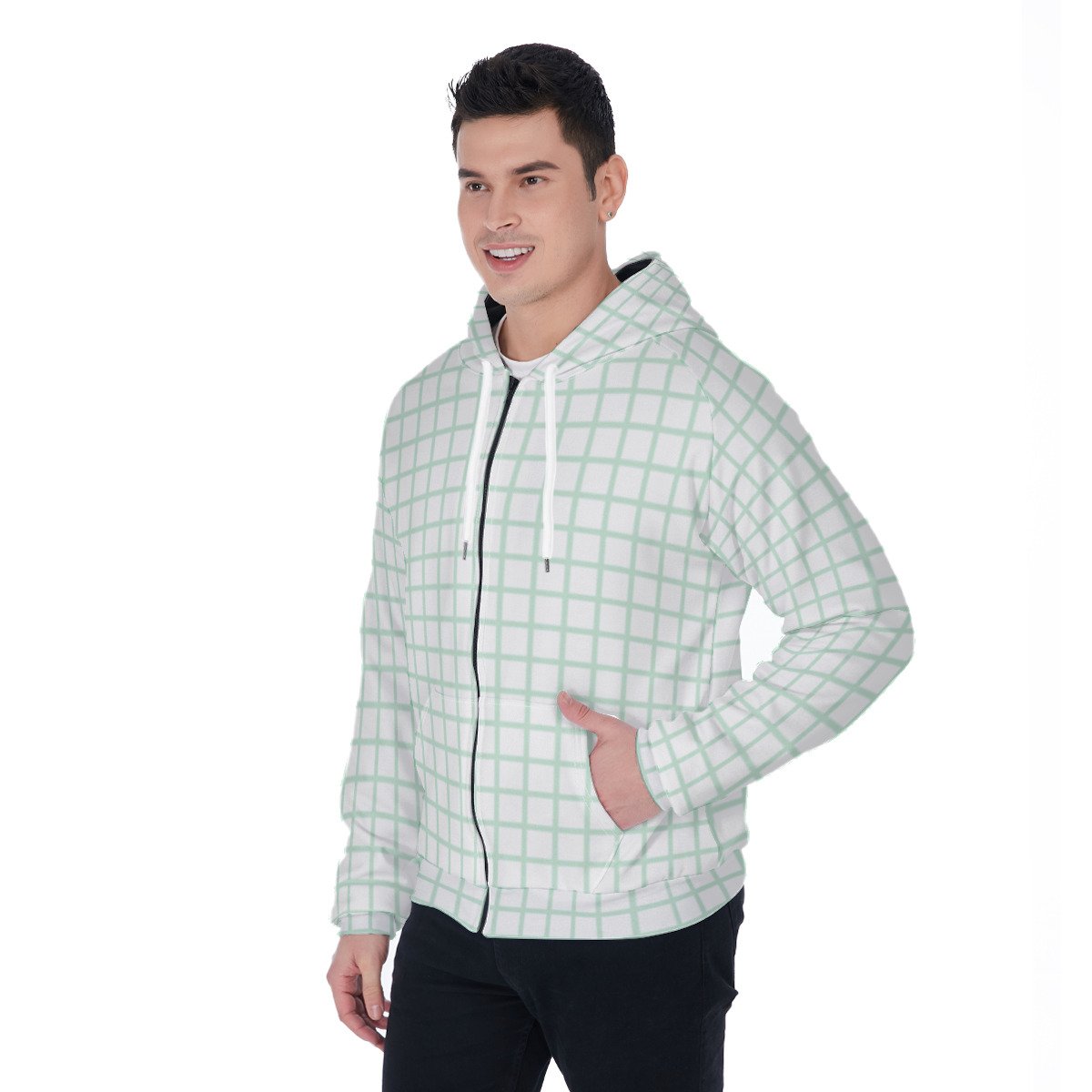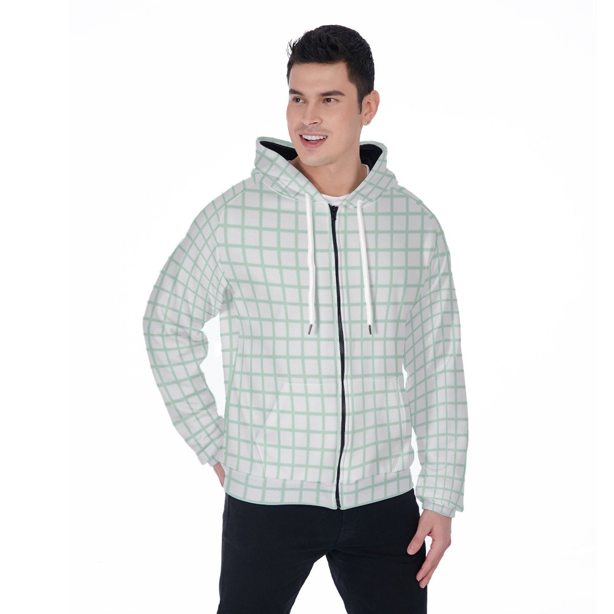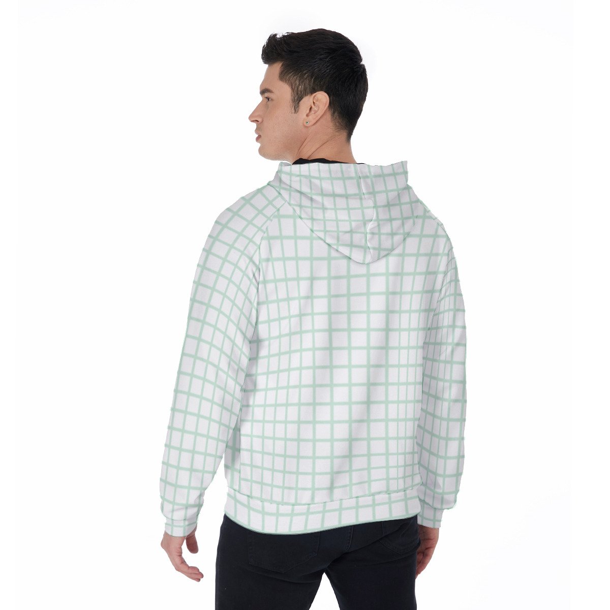 - White drawstring, front pocket, black inner hood, raglan sleeve, black zipper