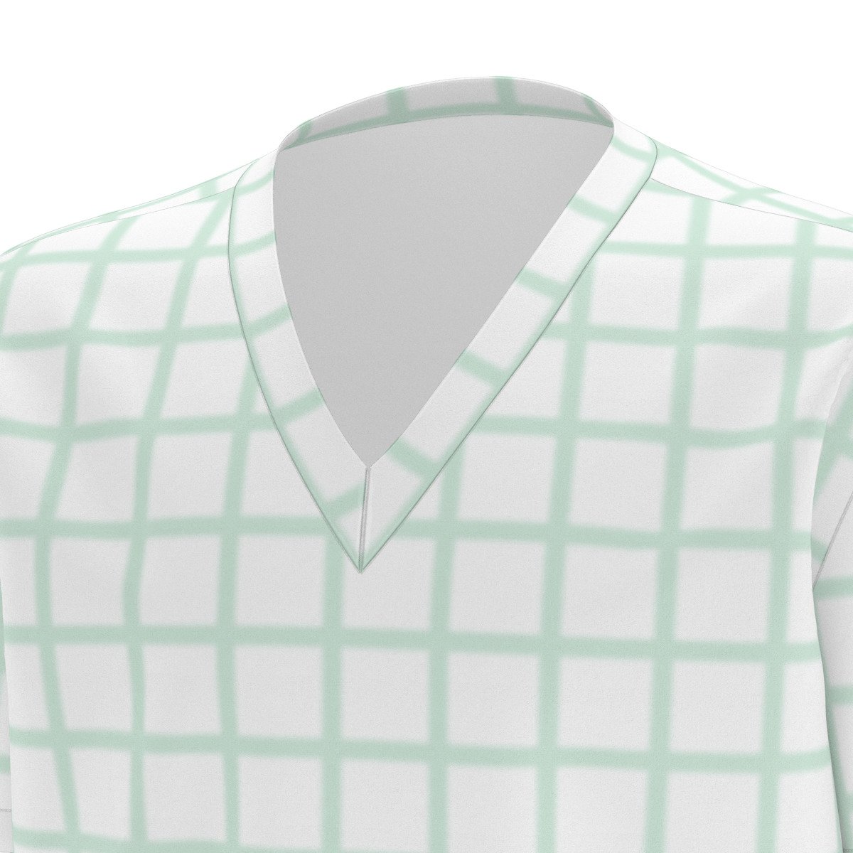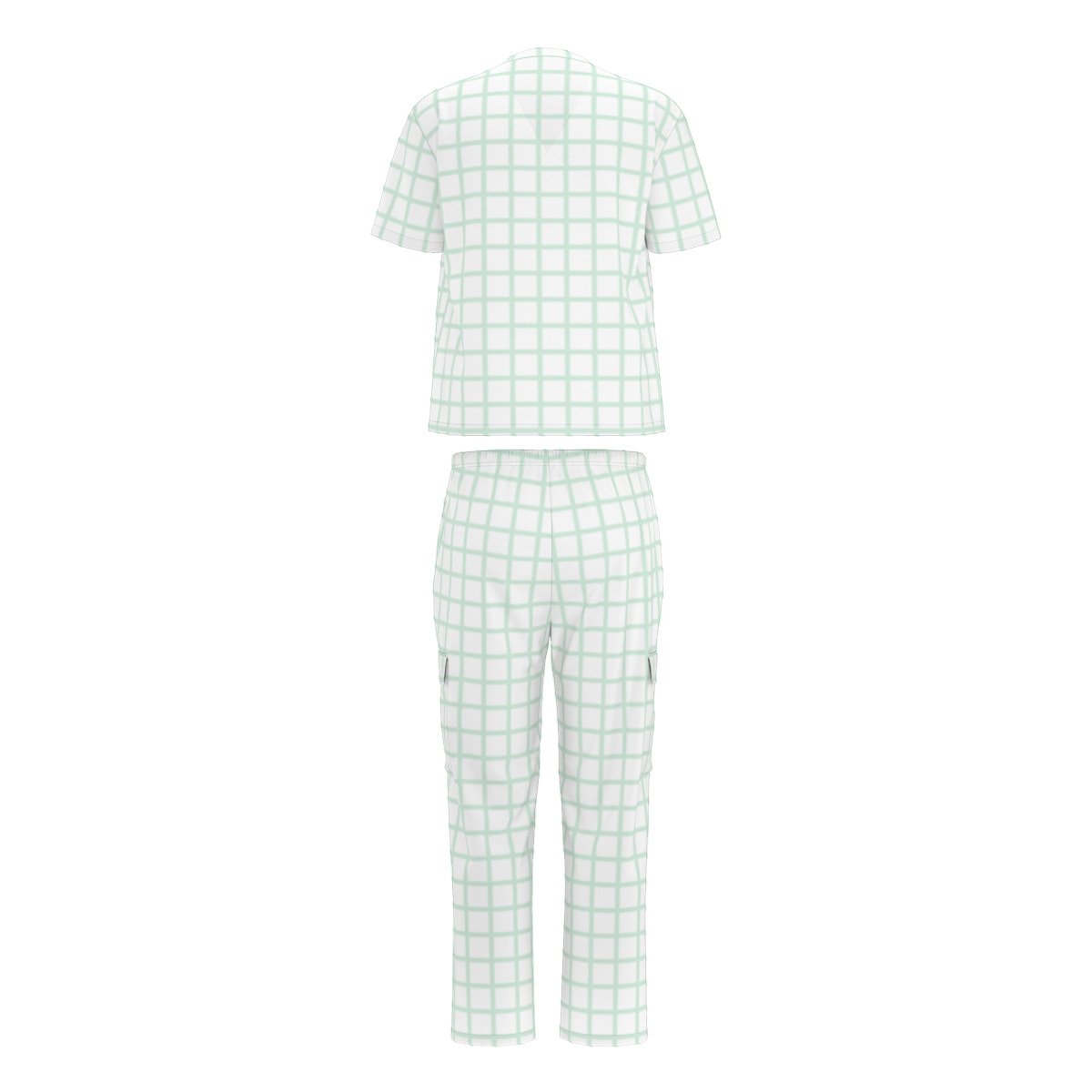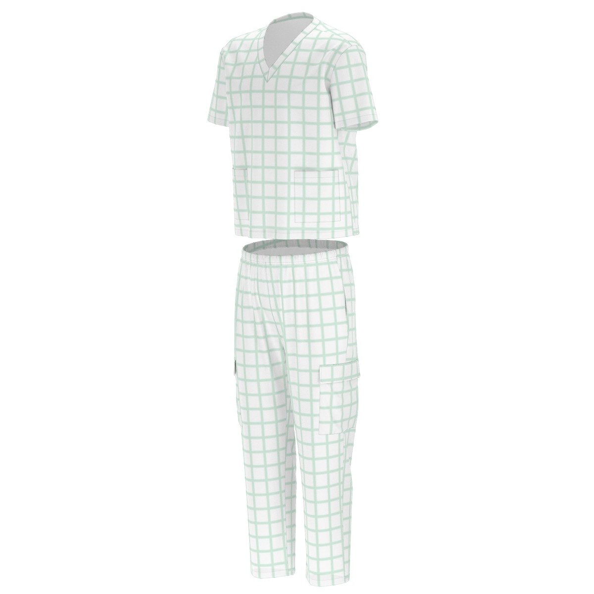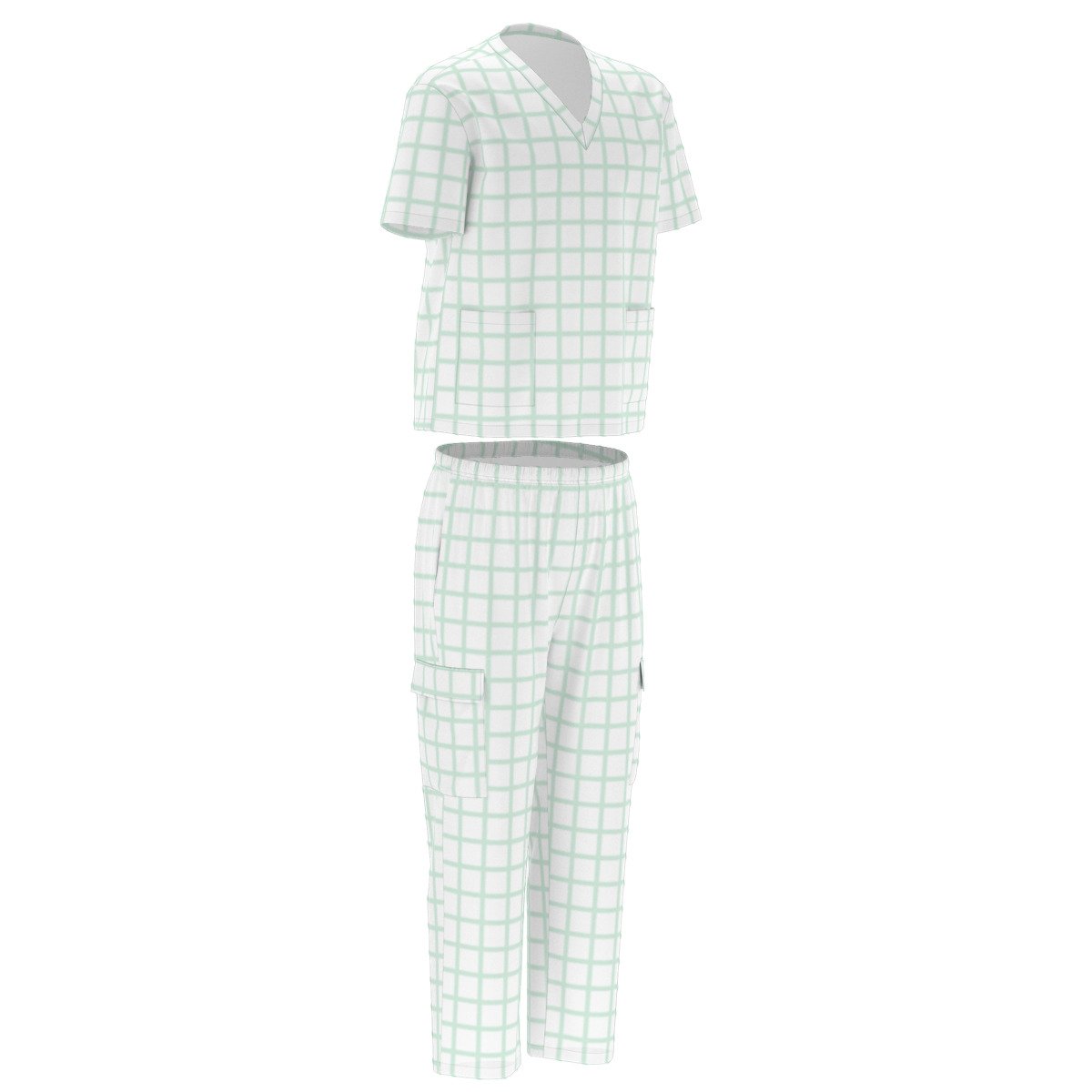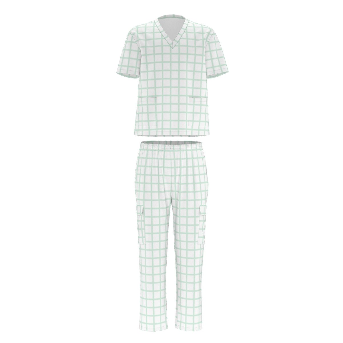 - V neckline,Two deep pockets,two side patch pockets on the pants and two patch pockets on the shirt