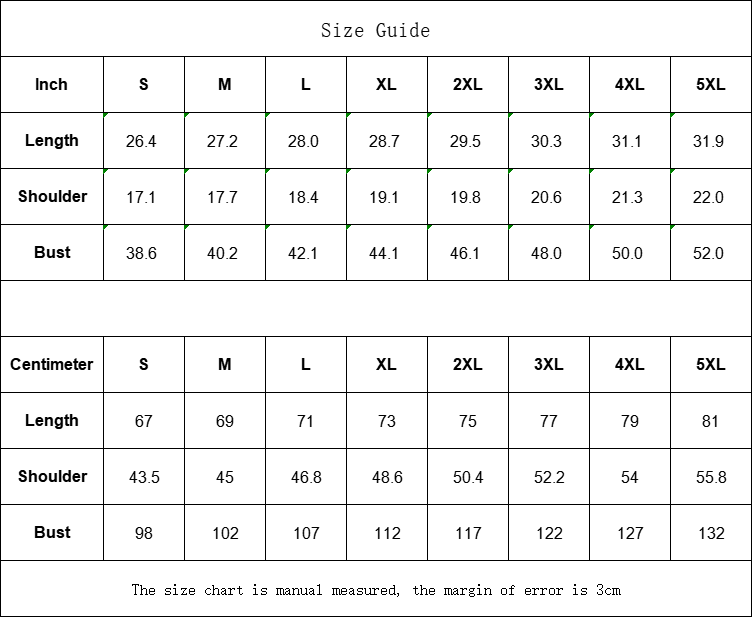 | Centimeter | S | M | L | XL | 2XL | 3XL | 4XL | 5XL |