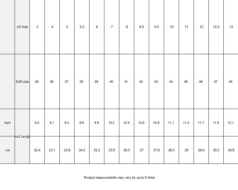 | US Size | 3 | 4 | 5 | 5.5 | 6 | 7 | 8 | 8.5 | 9.5 | 10 | 11 | 12 | 12.5 | 13 | |